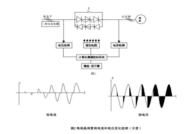 當(dāng)起動完成后, 三相旁路接觸器 J 自動吸合, 電動機投入電網(wǎng)運行(見 圖 1)。輸入/輸出電壓波形和電流變化的波形